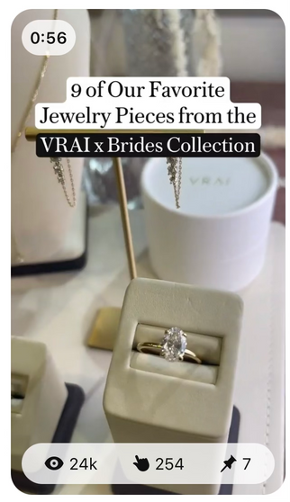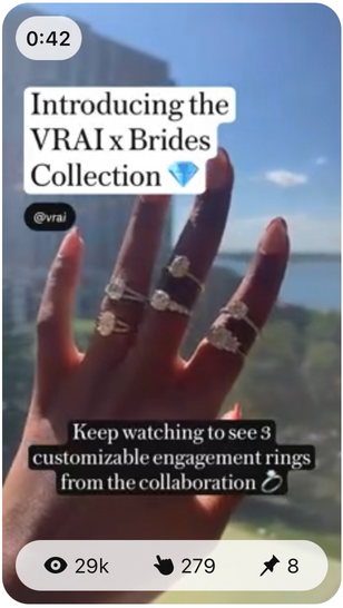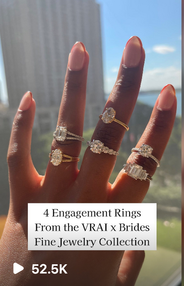 Brides launched a lab-grown diamond jewelry collection with sustainable brand VRAI. I took the lead on capturing organic social content. Here's a sample of what I captured to launch the partnership and shop the products to drive traffic & revenue.