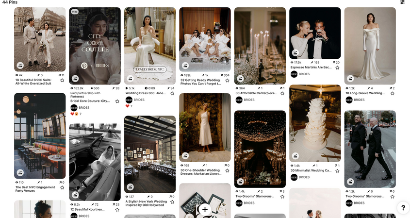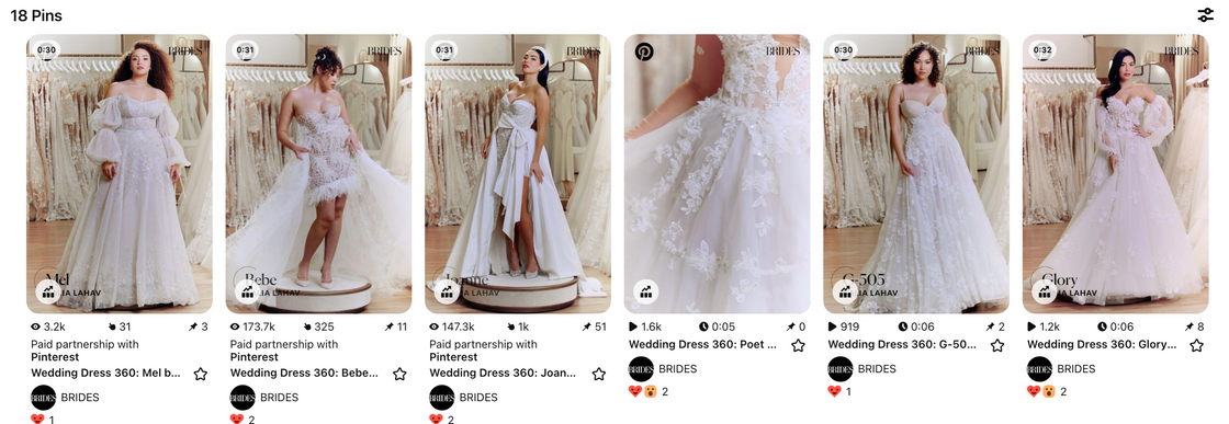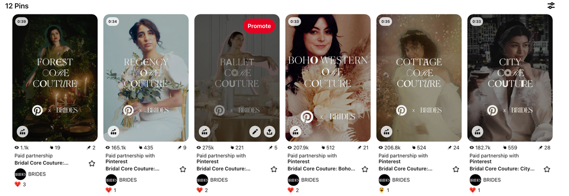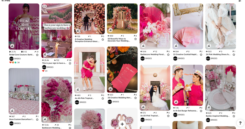 In 2023, Brides kicked off a video series partnership on Pinterest. I worked closely with the production team, editorial team, and my social team to successfully launch two video series: Bridal Core Couture & Wedding Dress 360. Core Couture is all about the aesthetics that you see taking over socials (think: Barbiecore). To expand on the strategy for this series, we curated individual boards filled with organic and inspirational wedding content from Brides.com to match each aesthetic for actionable content our audience can save. This resulted in driving more views to the series while also driving traffic to our site and building Brides engagement. Here is a sample of the numbers for each episode in the two series & samples of the curated boards.