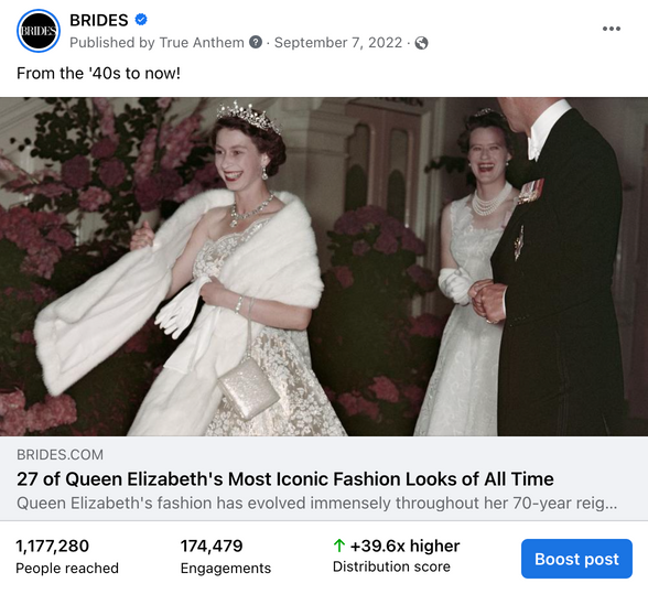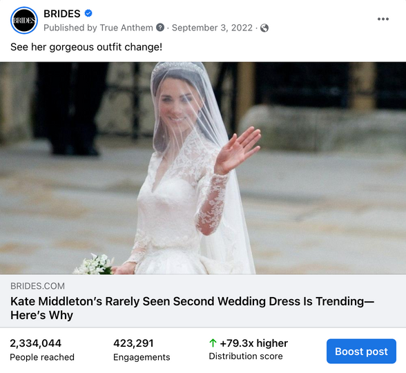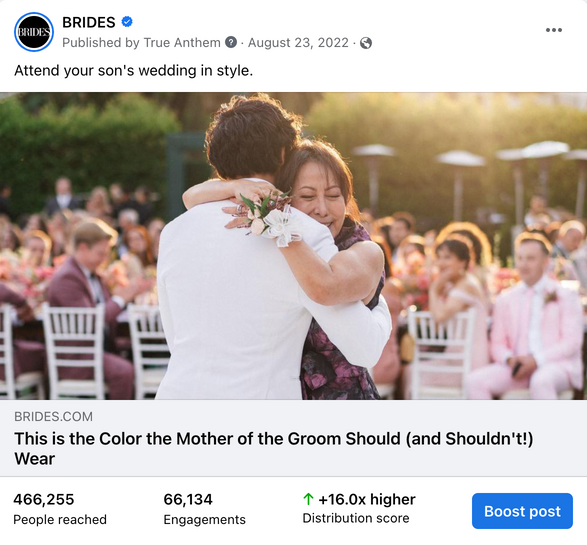 Social makes up about 5% of overall traffic for Brides with Facebook being the number one social traffic driver. I took over our Facebook strategy In June 2022 and have grown our traffic over 20% almost consistently MoM. Here are samples of some of the top traffic driving posts.